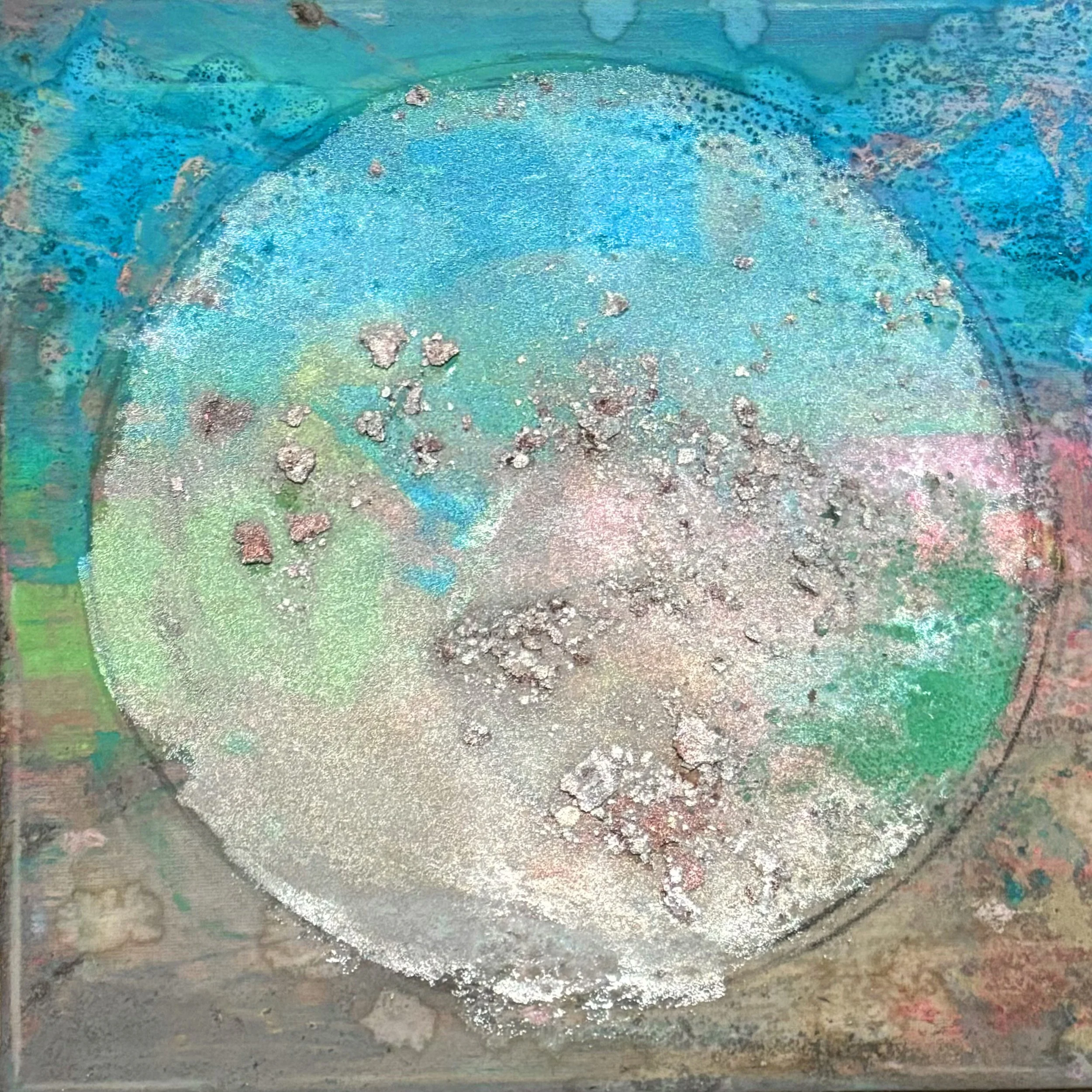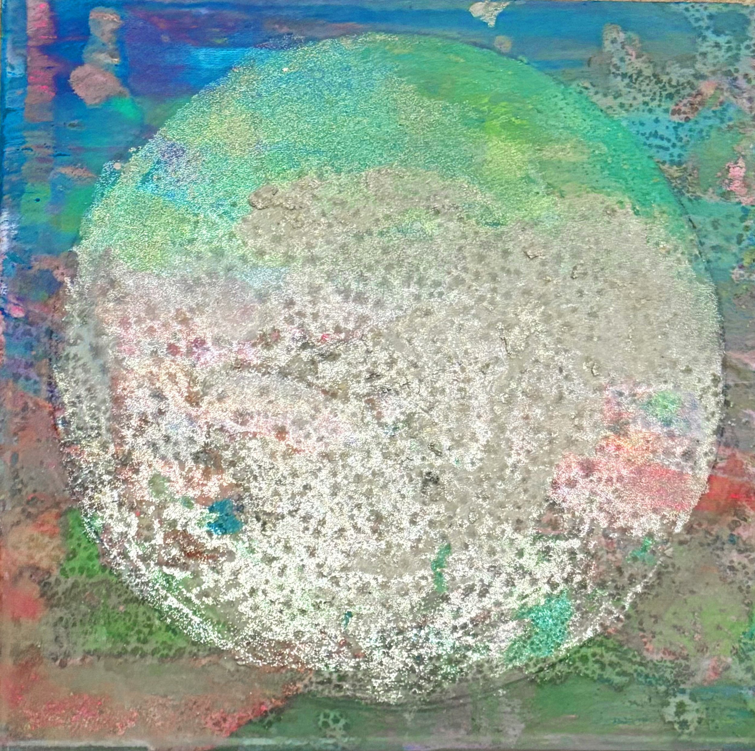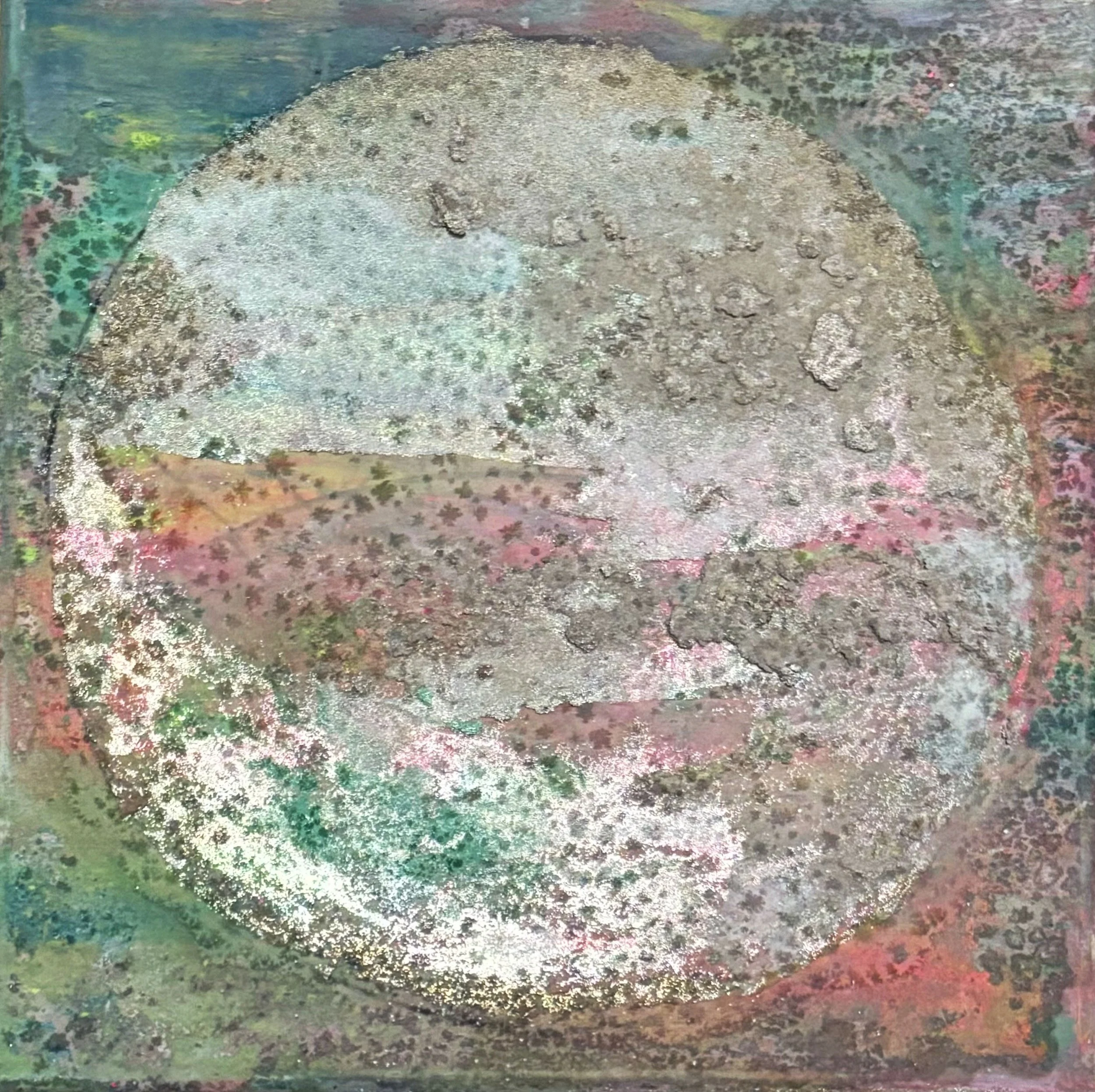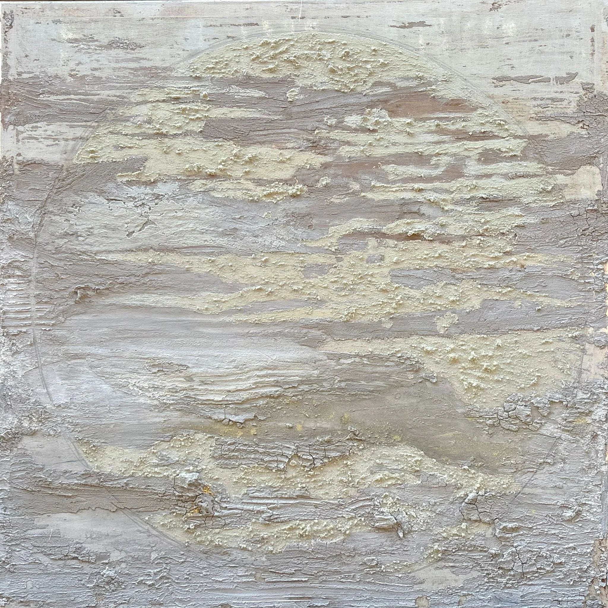 OBJECTS IN SPACE – PRIMA LUNA | Objects in Space: Song by La Dispute | MIXED MEDIA: PIGMENTE, GOUACHE, MARMORMEHL, KREIDE, INGWER, GALGANT, SALZ, GLASPARTIKEL | FORMAT: 100 x 100 CM