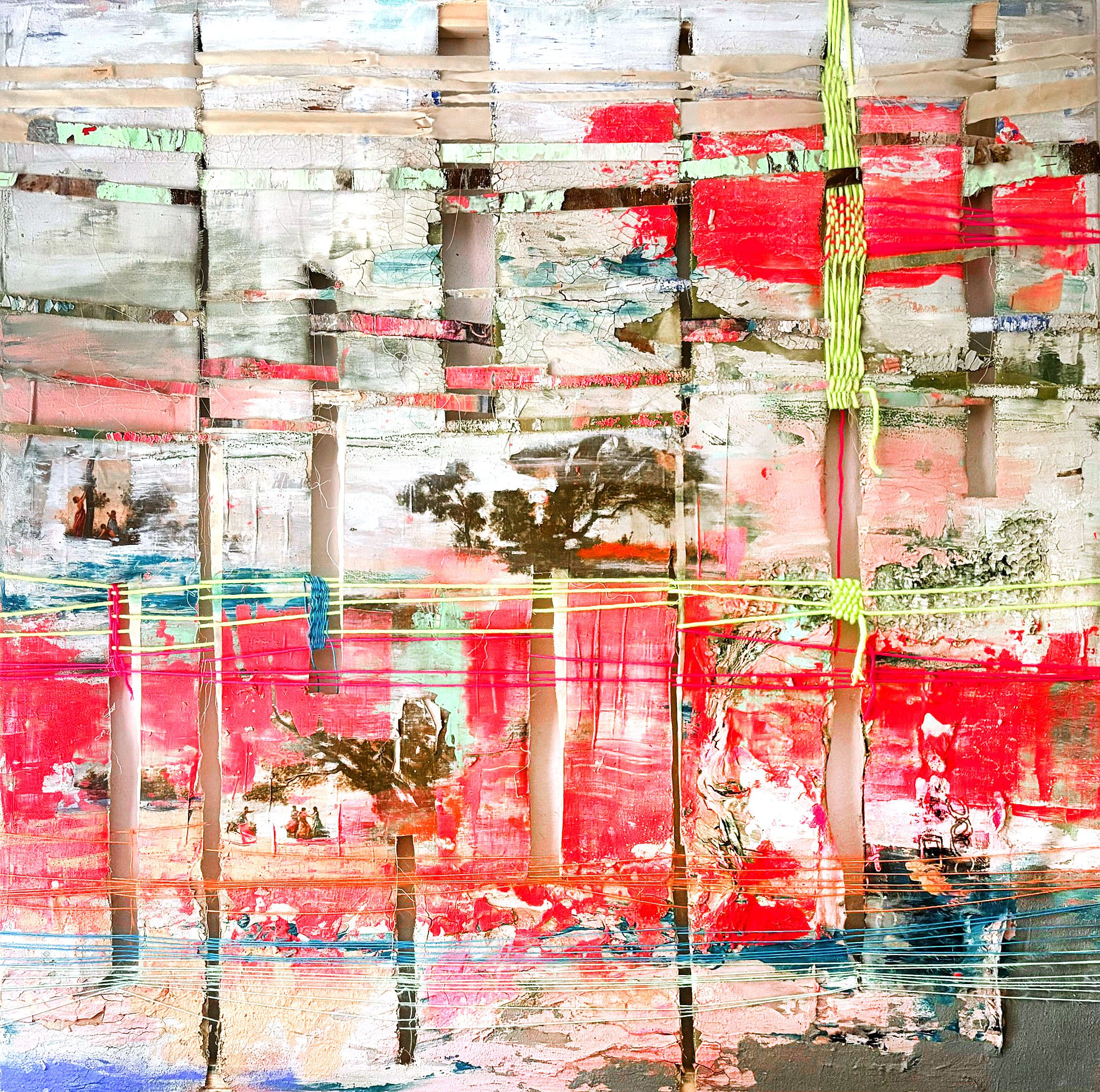 SEE I KEEP FALLING FOR THE FUTURE, AFTER TRIPPING ON THE PAST | Lyrics by La Dispute | MIXED MEDIA: LAMPENSCHIRM STOFF, WOLLE, PIGMENTE, GEWOBENE LEINWAND, COLLAGE, PASTELLKREIDE, BETON, VERPACKUNGSMATERIAL, SEIDENTUCH | FORMAT: 100 x 100 CM | 2025